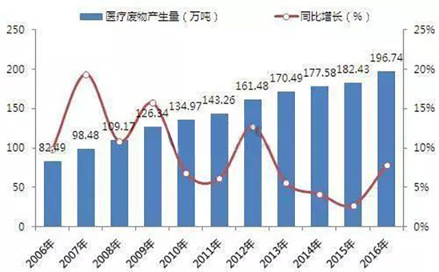 据前瞻数据统计,从2006年到2016年十年的时间里,全国医疗废物的产量从82.49万吨上升到196.74万吨,足足翻了一倍。在这些医疗废物中,住院部门产生的废物占全部医疗废物的90%。